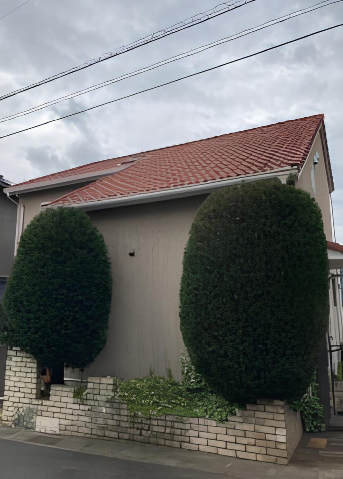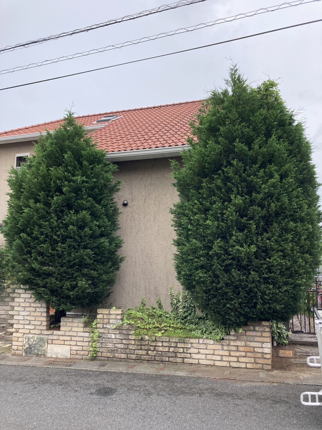 多治見市にお住まいのお客様より、「庭のコニファーが大きくなりすぎたため整えてほしい」とのご依頼をいただきました。洋風のご自宅と外構の間に植えられた2本のコニファーが、年数の経過とともに高さ・幅ともに成長。見た目のバランスが悪くなっているだけでなく、枝が張り出したことで通行しづらくなっている点もお悩みでした。