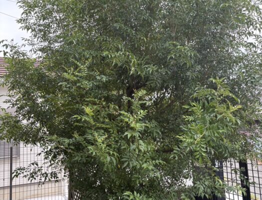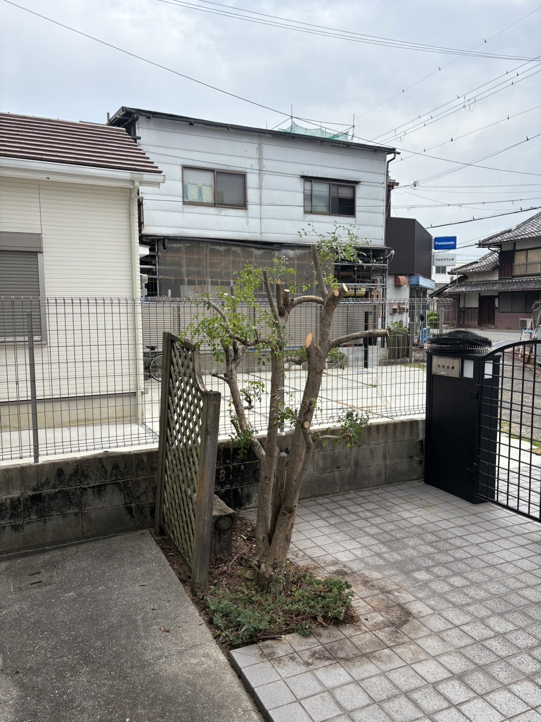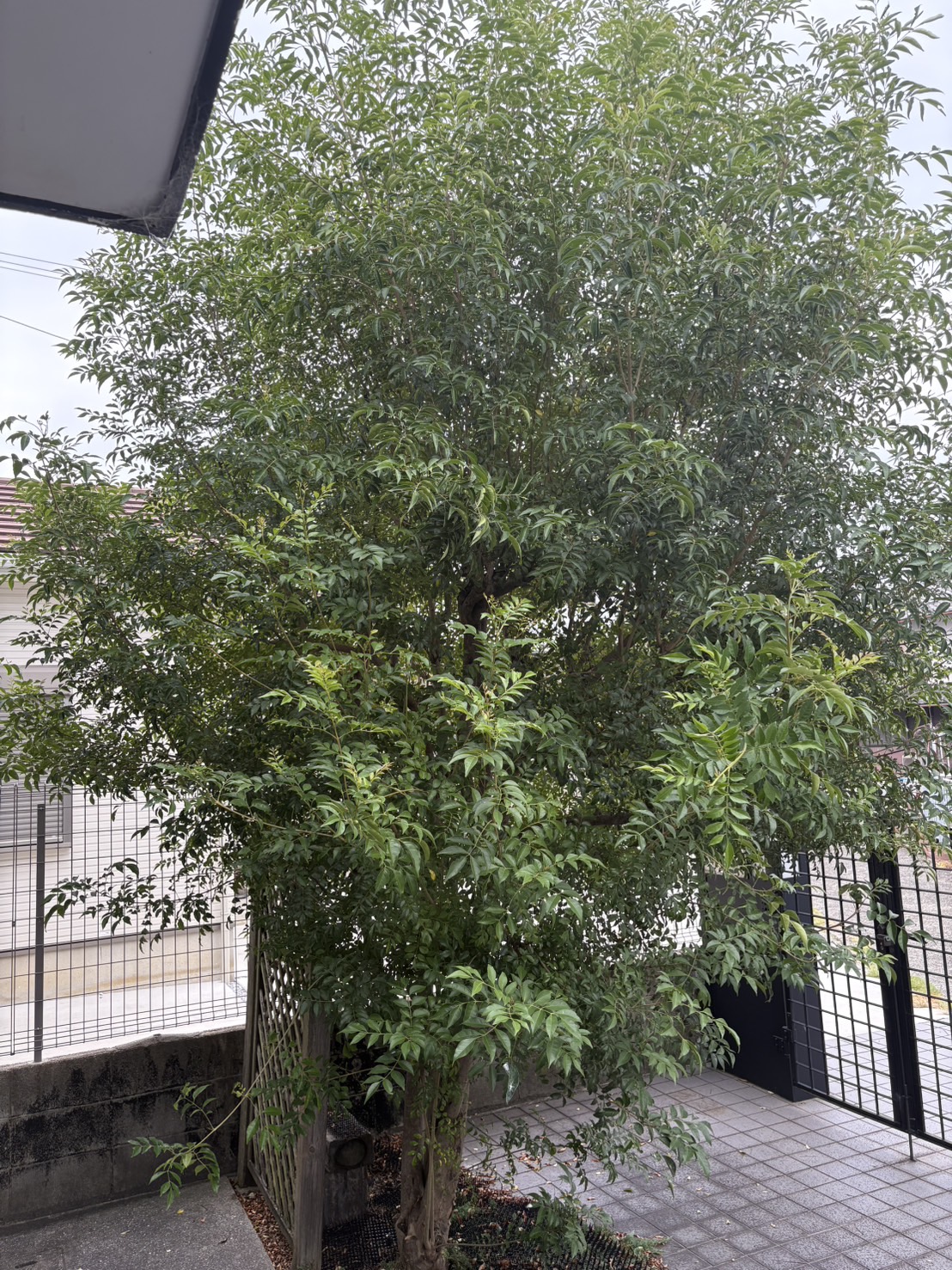 多治見市のお客様から「玄関前の木が気づいたら2階くらいの高さになってしまって、玄関も暗くなるし、毎日の出入りで邪魔なんです」とご相談をいただきました。