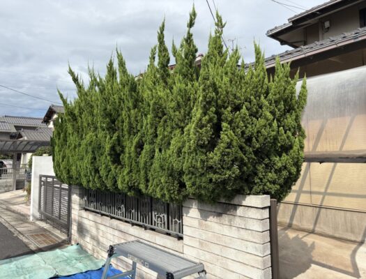 対象となったのは、敷地境界のフェンス沿いに植えられたカイヅカイブキの生垣です。お客様からは、仕事や日々の生活が忙しく、なかなか剪定のタイミングが取れずに数年間放置してしまったというお悩みを伺いました。気がついた時には枝葉が1階の屋根を超える高さまで成長し、フェンスを突き抜けて道路側まで大きく張り出していたため、通行人へのご迷惑や視界の妨げを大変心配されていました。