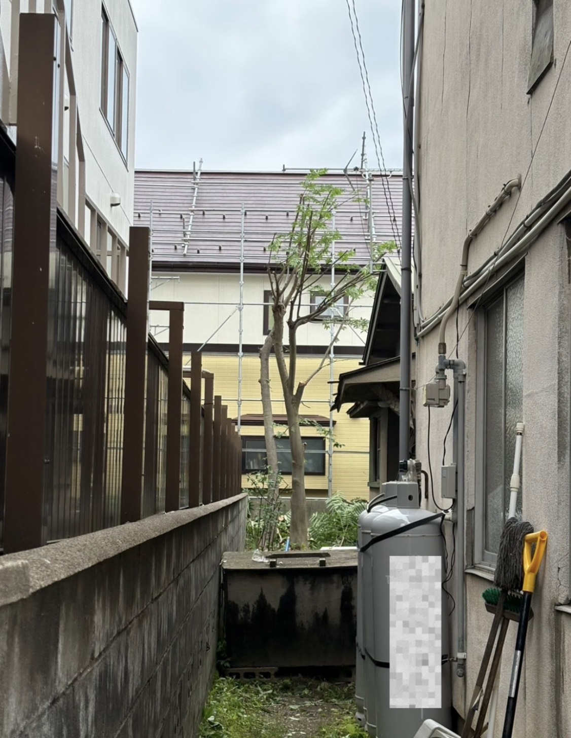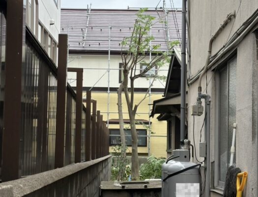 隣家に枝や木くずが落ちないよう養生を行い、作業後はしっかり清掃!